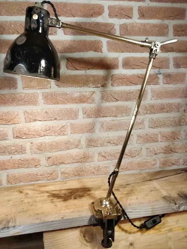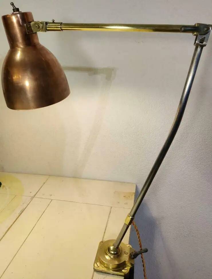 The use of different materials is unique to the example with copper shade; the reflector is made of copper, one arm is made of brass, one arm is made of steel, and the foot is made of brass and steel. The other one has brass arms and an enamel hood.