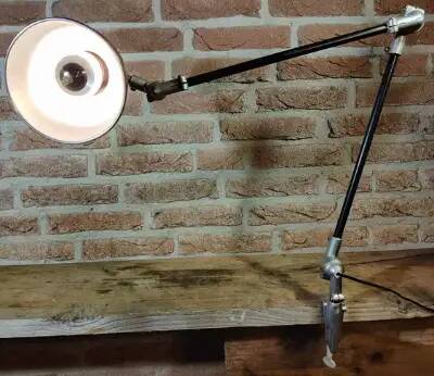 This lamp is not a workshop lamp, although it does have the same appearance. This is an architect's lamp designed by Marque Rijo. With black arms and hood, aluminum hinges, and table clamp. I have not been able to find any additional (reliable) information about this brand, presumably from Denmark.